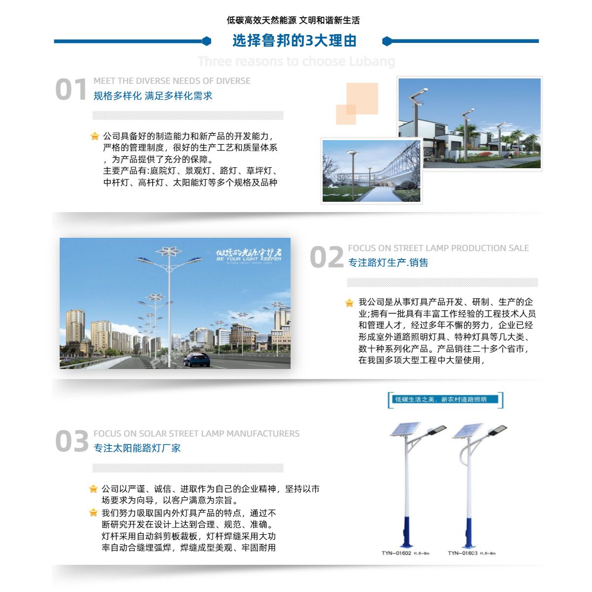 喀什市魯邦燈具廠是從事燈具產品開發、研制、生產的企業;產品有:太陽能路燈,高桿燈,景觀燈,庭院燈,中華燈,監控桿燈等擁有一批具有豐富工作經驗的工程技術人員和管理人才,經過多年不懈的努力,企業已經形成室外道路照明燈具、特種燈具等幾大類、數十種系列化產品。產品銷往二十多個省市,在我國多項大型工程中大量使用。公司具備完善的制造能力和新產品的開發能力,嚴格的管理制度,很好的生產工藝和質量體系,為產品提供了充分的保障。公司以嚴謹、誠信、進取作為自己的企業精神,堅持以市場要求為向導,以客戶滿意為宗旨。公司將以產品質量和銷售服務為各界用戶提供放心的產品、滿意的服務。